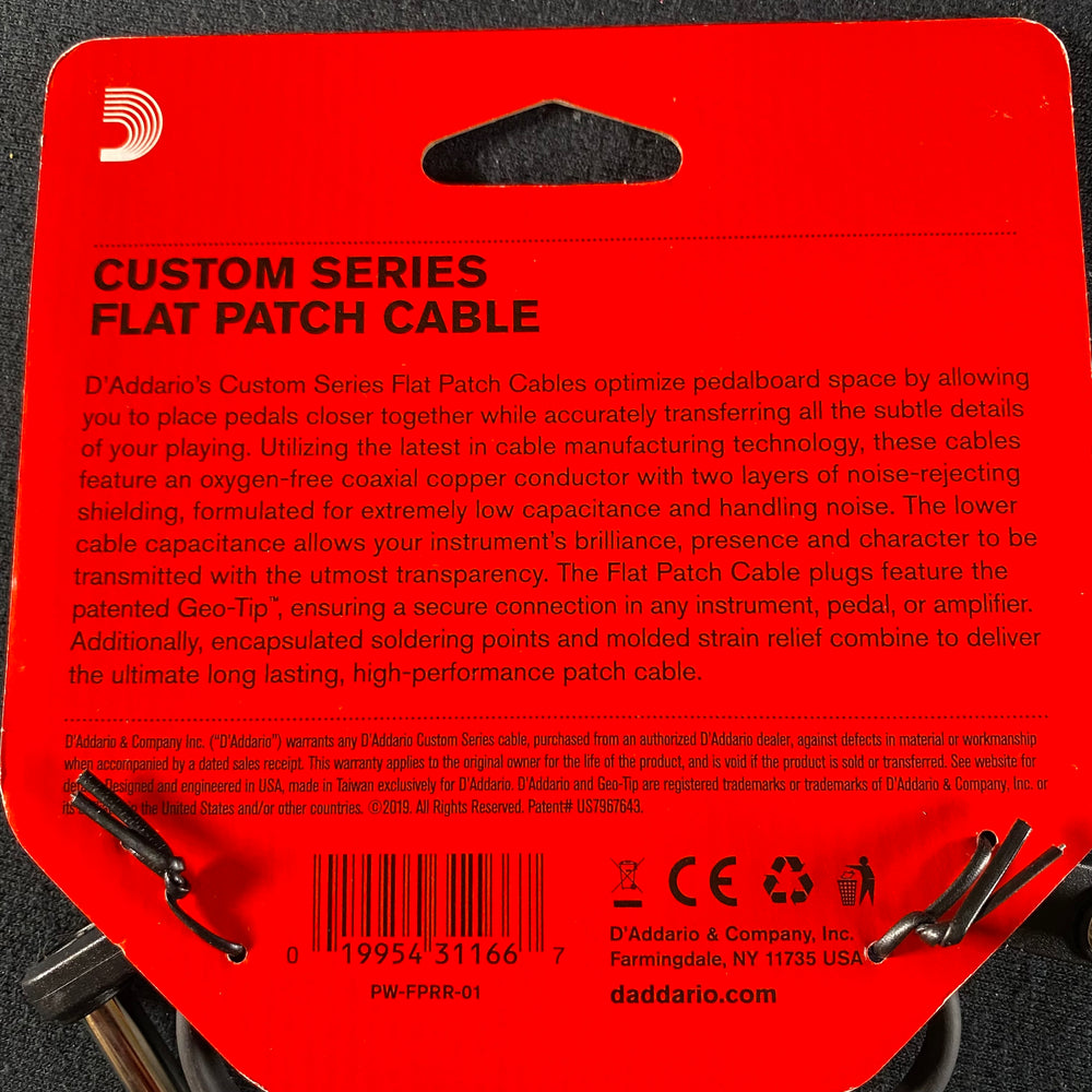 D’Addario’s Custom Series Flat Patch Cables optimize pedalboard space by allowing you to place pedals closer together while accurately transferring all the subtle details of your playing. Utilizing the latest in cable manufacturing technology, these cables feature an oxygen-free coaxial copper conductor with two layers of noise-rejecting shielding, formulated for extremely low capacitance and handling noise. The lower cable capacitance allows your instrument’s brilliance, presence and character to be transmitted with the utmost transparency. The Flat Patch Cable plugs feature the patented Geo-Tip™, ensuring a secure connection in any instrument, pedal, or amplifier. Additionally, encapsulated soldering points and molded strain relief combine to deliver the ultimate long lasting, high-performance patch cable.