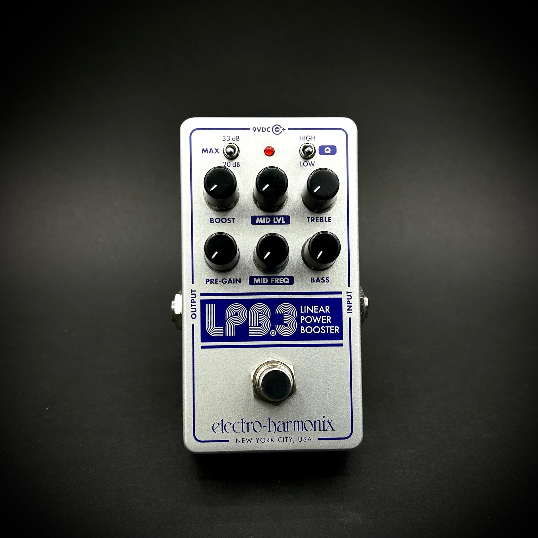 Housed in EHX’s Nano-sized chassis, the LPB-3 is capable of boosting up to +33dB of clean gain with the powerful tone shaping of a 3-band EQ with parametric Mids. The active 3-Band EQ features TREBLE and BASS knobs to control the highs and lows plus a powerful parametric Mids control with adjustable MID FREQ and Q. BOOST sets the overall output of the pedal with the MAX switch toggling between 20dB and 33dB of maximum boost. Use the PRE-GAIN knob to fine-tune the total gain and volume of the boost.