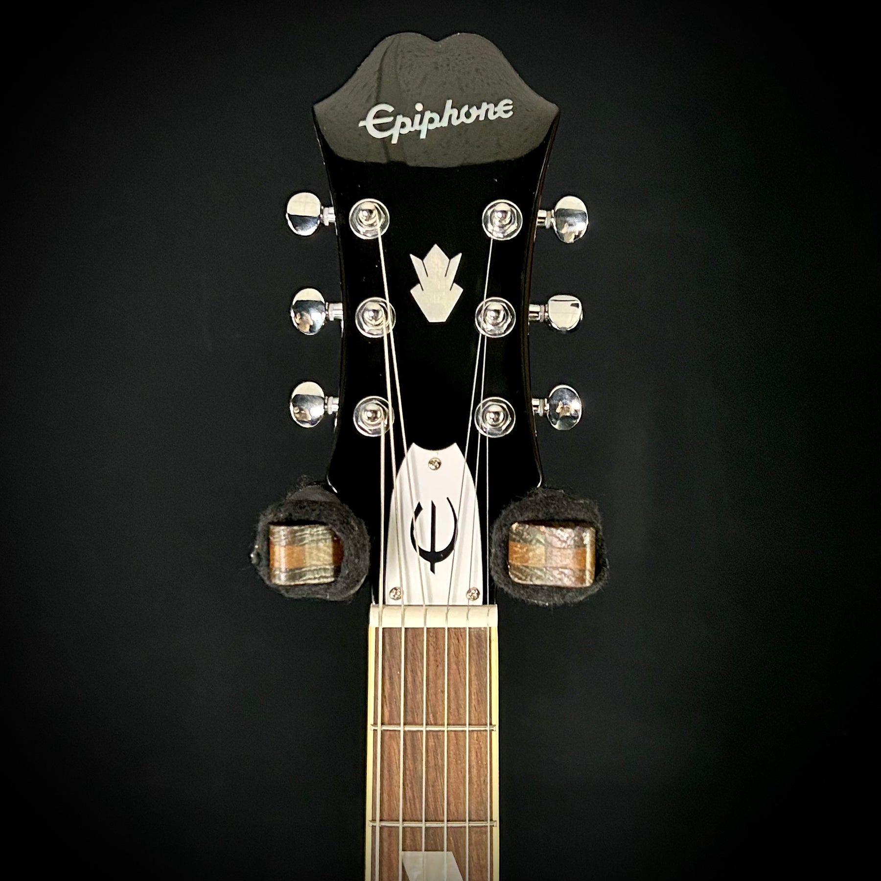 Based on Noel Gallagher's 1983 Riviera from the early Oasis tours, this signature model includes many historical elements from the original instrument still in the artist's collection. The color and finish closely match original models from that era, while historically accurate details such as "E" appointments on the pickguard and truss rod cover and a brown sound hole label give this guitar a vintage feel. The guitar features a replica of the artist's signature on the back of the headstock and comes complete with an Epiphone hardshell case.