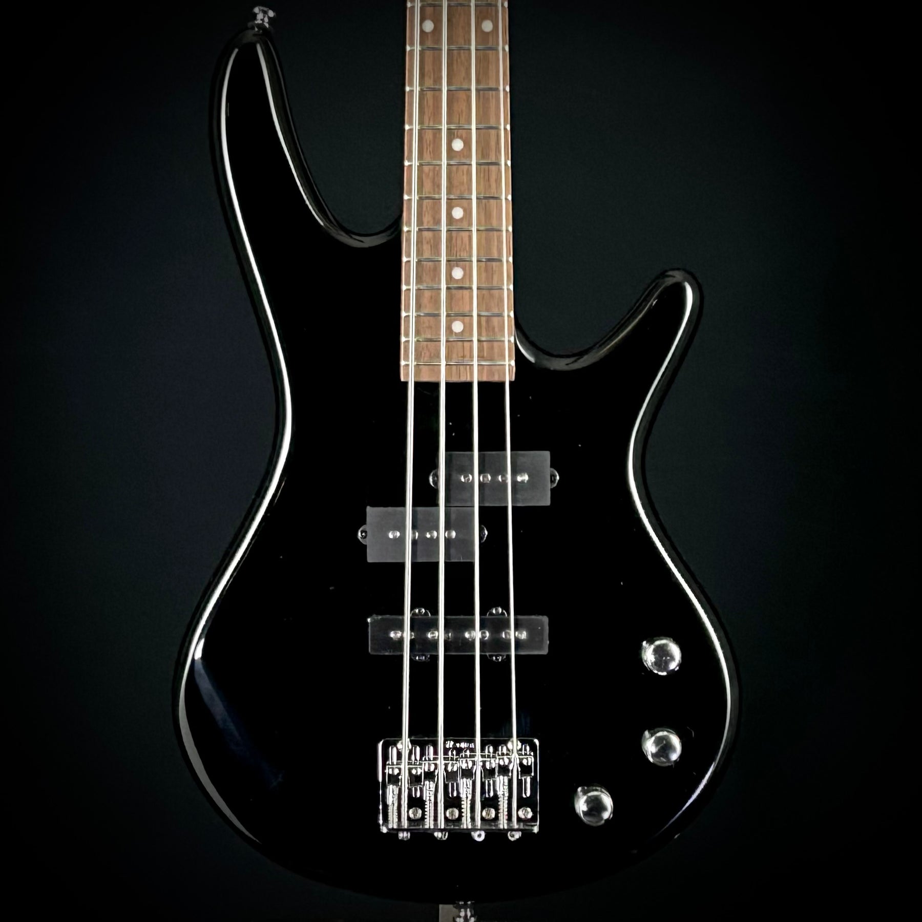 The GSRM20 is a short-scale bass from Ibanez's miKro series, featuring a 726mm/28.6-inch scale length. It features a GSRM4 maple neck that provides stability and bright tonal character, paired with a bound purpleheart fretboard that emphasizes beauty and rich tonal character. The poplar body is equipped with Dynamix P and J pickups positioned at the neck and bridge respectively. The controls include individual volume knobs for each pickup and a tone control. It comes with a B10 bridge with 19mm string spacing and medium frets across 22 positions.