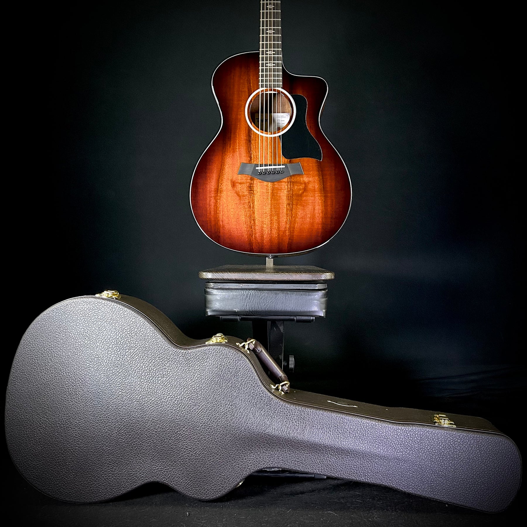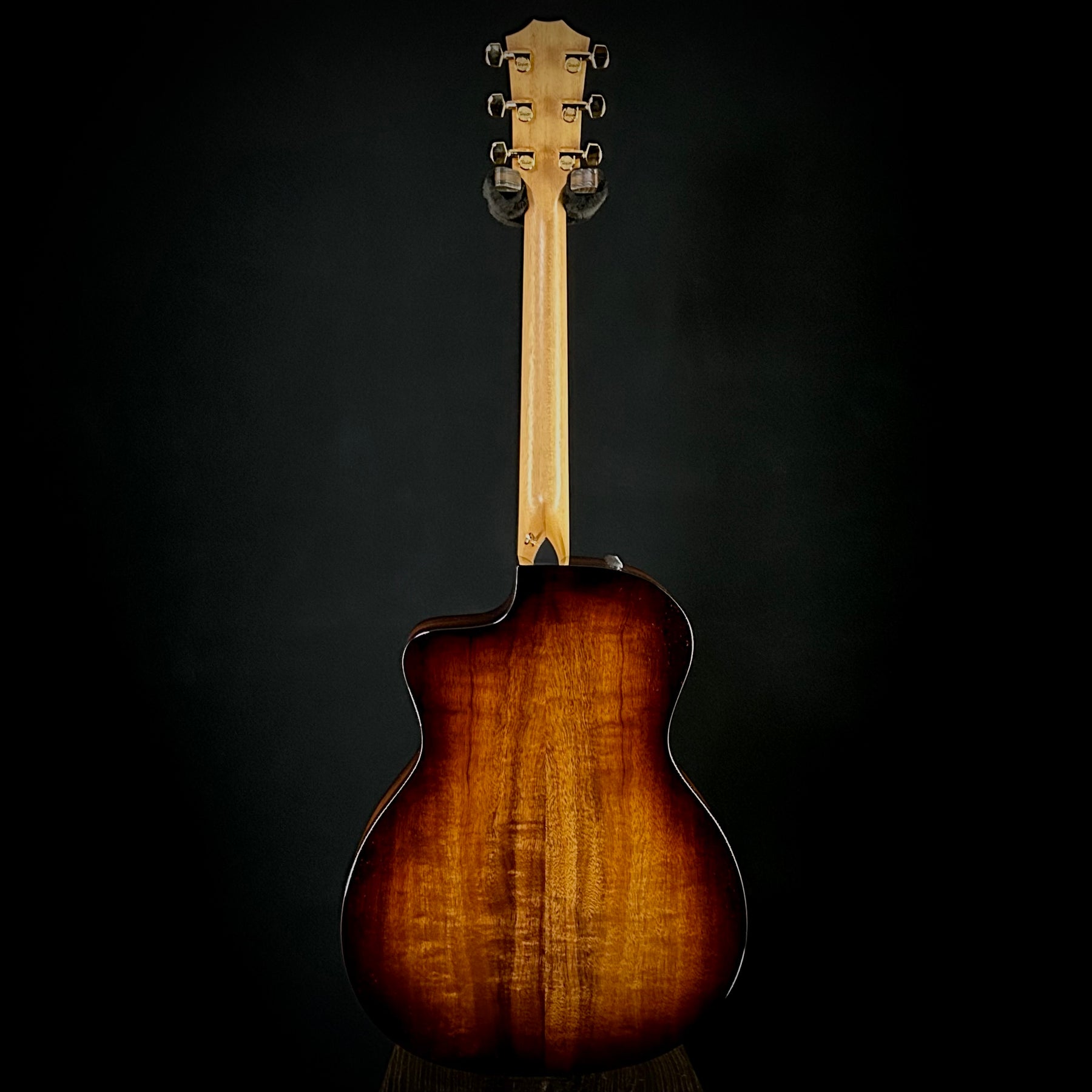 Fans of Hawaiian koa will love the look, feel and sound of this all-koa Grand Auditorium. A shaded edgeburst elevates the vintage appeal of the solid koa top, which is paired with layered koa back and sides, while a gloss finish wraps the body in a rich sheen. The Grand Auditorium’s musical versatility makes this a great all-purpose guitar for both strumming and fingerpicking, and the hardwood koa top will even out a lively attack to produce a focused, linear voice. Player-friendly modern features include a cutaway and Taylor’s ES2 acoustic electronics. Among the distinctive appointments are a single-ring faux pearl rosette in an interlocking “fishbone” pattern, black binding, Italian acrylic small diamond inlays, and chrome tuners. The guitar ships in a Taylor deluxe hardshell case.