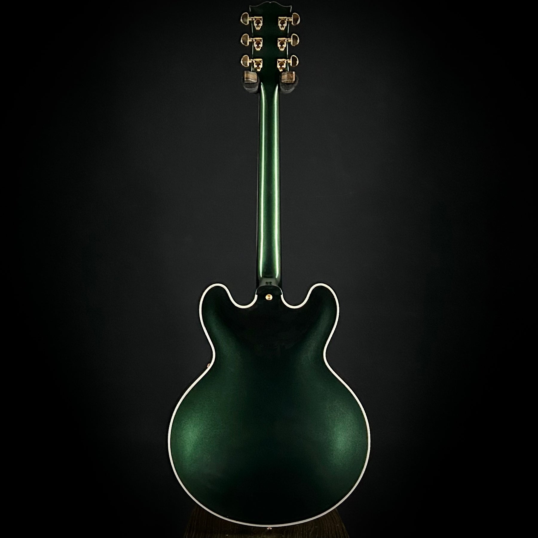 The Gibson Custom Shop 1959 ES-355 Reissue in British Racing Green merges vintage authenticity with contemporary craftsmanship. This semi-hollow body features a three-ply maple construction with solid maple centerblock, engineered to deliver balanced resonance across a wide tonal spectrum—from warm, open lows to articulate highs. The mahogany neck with medium '59 C profile and long tenon neck joint, secured with hide glue, maximizes vibration transfer for superior sustain and bloom. Paired Custombucker Alnico 3 pickups faithfully recreate late-'50s PAF character, offering rich harmonic complexity and responsive dynamics across clean passages and aggressive leads alike. An ebony fingerboard with mother-of-pearl block inlays, Custom Split Diamond headstock, and period-correct hardware including amber Catalin switch tip and tortoise pickguard complete this instrument. British Racing Green's luminous finish shifts under stage lighting, creating a visual presence as commanding as its sonic capabilities. A guitar that honors Gibson's golden era while delivering modern precision performance.
