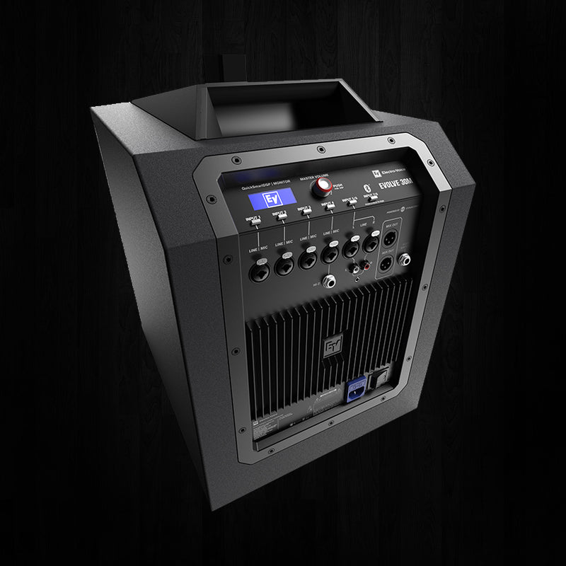 The Electro-Voice EVOLVE 30M is a versatile, ultra-compact PA system that's perfect for small and medium-sized venues. Packing 1000-watts of power, the Evolve 30M can be used on its own by solo artists or daisy-chained with other units for larger venues with ensembles. This PA system consists of three major parts: a potent 10" woofer, lightweight aluminum sub pole, and a column array with six 2.8" neodymium drivers. The Evolve 30M has a proprietary waveguide design that provides 120º of horizontal coverage and 40º of vertical coverage to ensure that the back of the house will always hear your mix. It has an onboard 8-channel digital mixer that can handle microphones, guitars, instruments, and many more. Featuring wireless control via the QuickSmart mobile app and seamless Bluetooth streaming, the Evolve 30M has enough functionality for almost any performer.